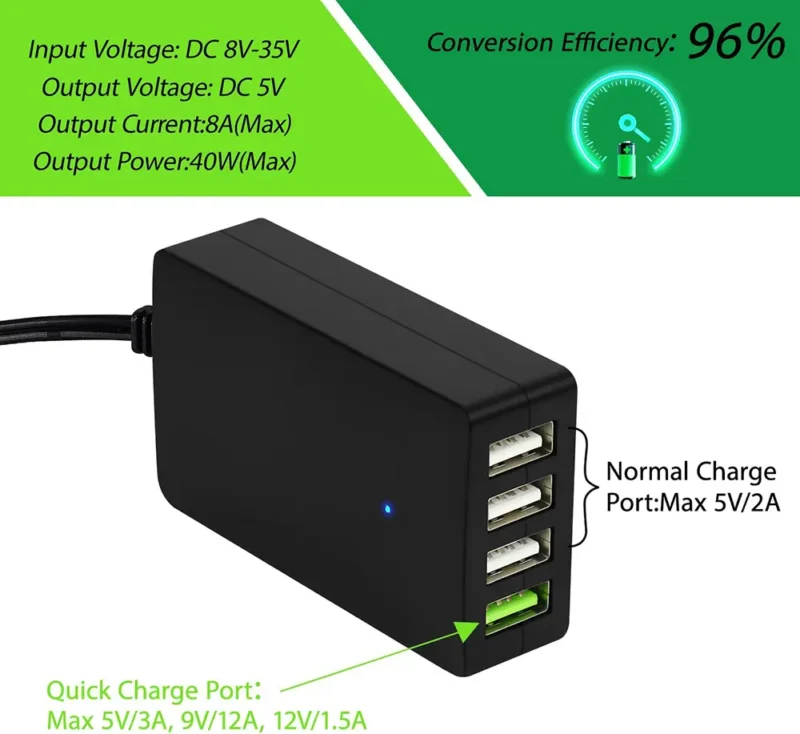 The LeMotech 4 USB Power Adapter Charger is a high-efficiency DC converter that transforms 12V/24V vehicle or battery power into stable 5V USB output for all your devices. With an input range of DC 8-35V, this adapter delivers up to 40W total power across its four USB ports. Each port provides 2A/10W output, with one port supporting fast charging protocols (compatibility-dependent).