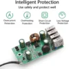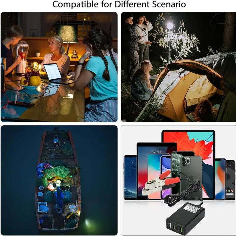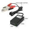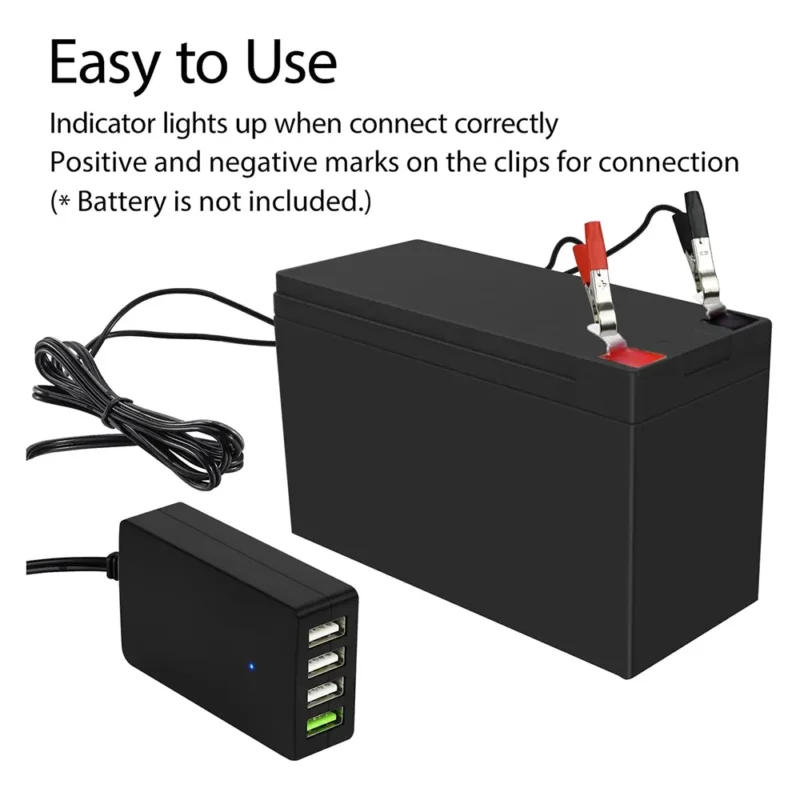 Engineered for reliability, it features 96% conversion efficiency to minimize energy loss during operation. Built-in safeguards include over-current, over-voltage, short-circuit, and overheating protection to keep your devices secure. The compact black housing comes with a battery clip for direct connection to lead-acid or lithium-ion batteries, making it perfect for emergency power banks, outdoor adventures, camping trips, and mobile setups. Charge iPhones, iPads, Android phones, tablets, and other USB-powered devices simultaneously while on the move.
