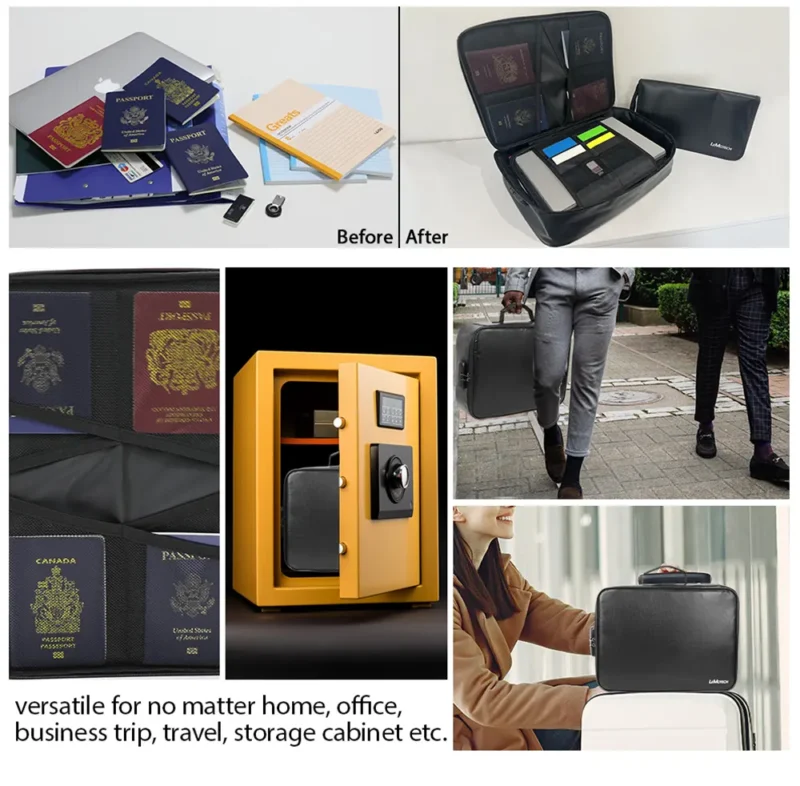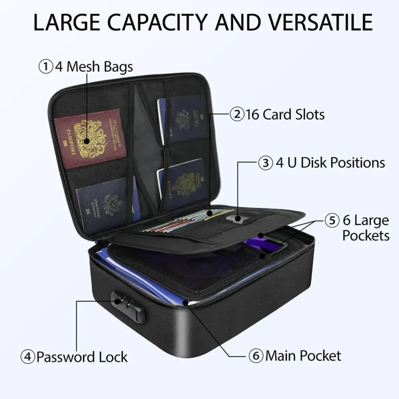 This premium set includes two versatile organizers: a large capacity storage bag (14.1″x10.6″x3.9″) featuring three-layer organization with multiple compartments, and a sleek letter-sized file folder bag (11.4″x6.6″x0.8″) with 12-layer subdivision. Both feature convenient 2-way zippers and a secure 3-digit combination lock to safeguard your birth certificates, passports, cash, cards, external drives, laptops, and confidential files.